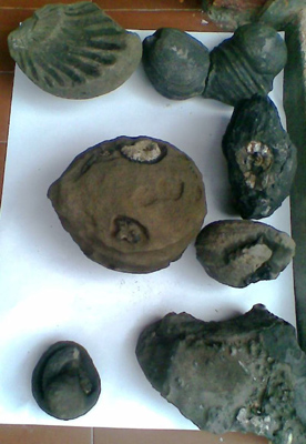26/6/2005 Pictures of fossils de MARIO, from left to right, Ammonites, Leaves and trunk of fern in slate stone, Peregrine shell and molar piece