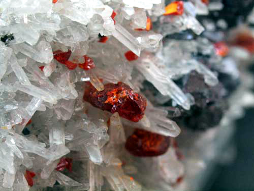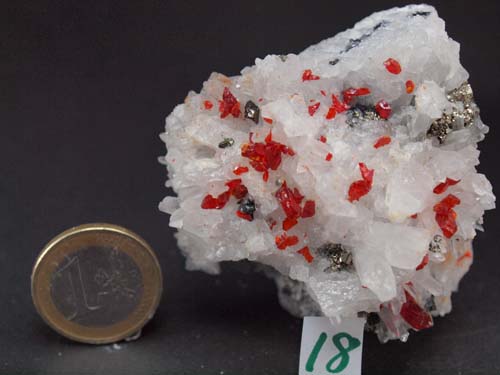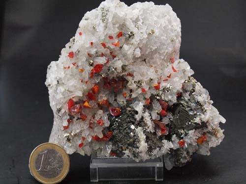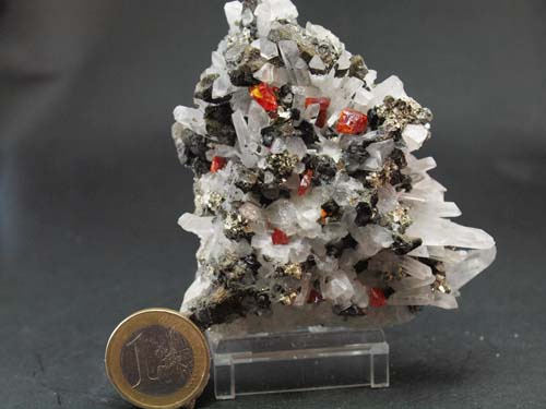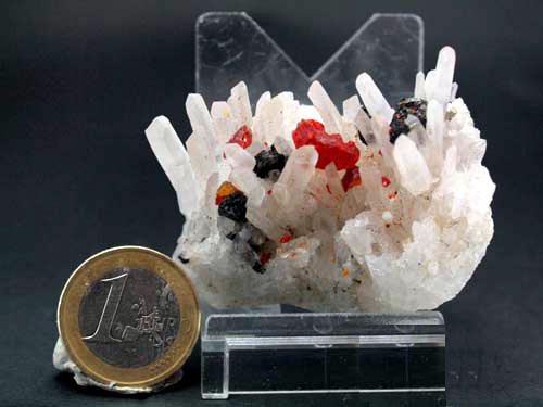 Quartz crystals (quartz crystal size 1,5cm) with realgar crystals on it and sphalerite crystals (sphalerite crystal size 1cm).Size 3cm x 7cm x 3cm