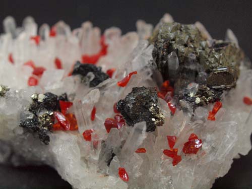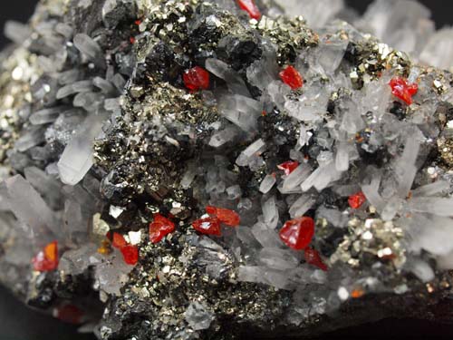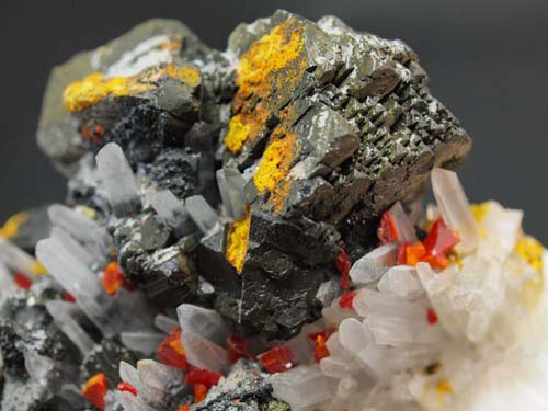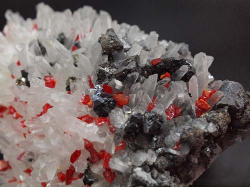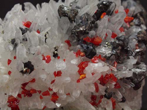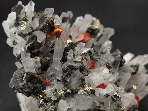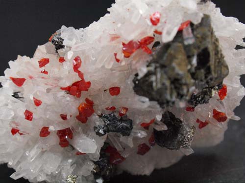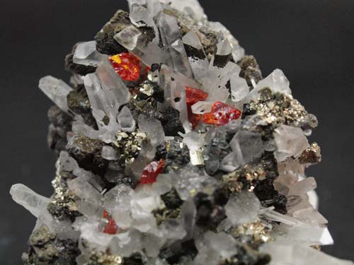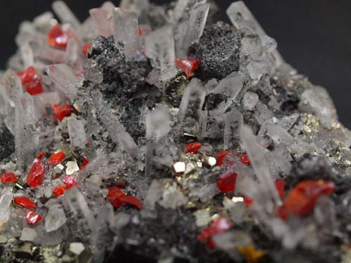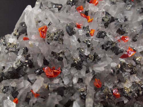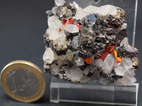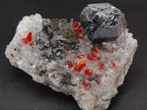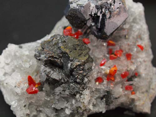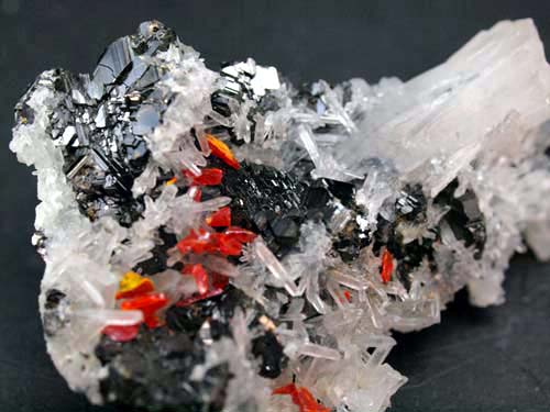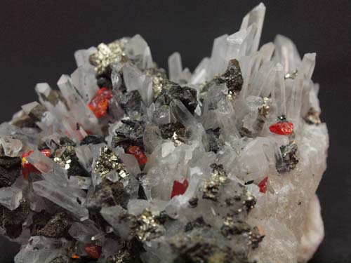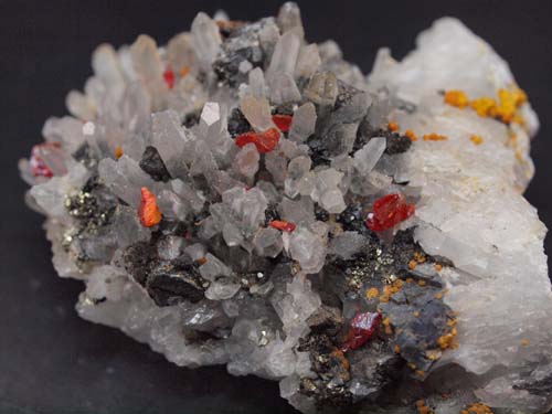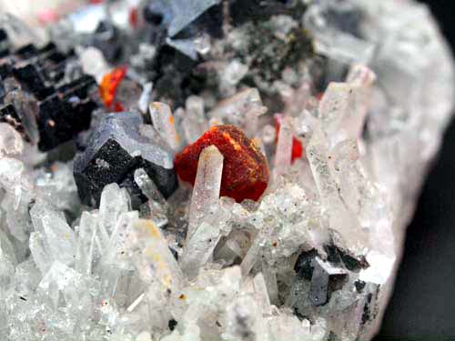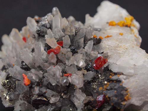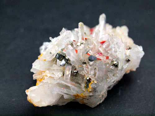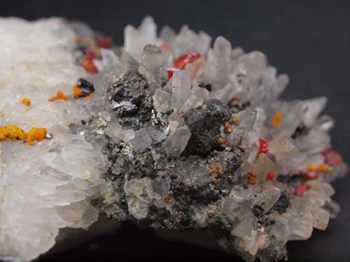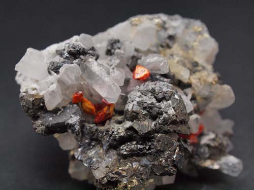 Quartz crystals with realgar crystals, galena crystals (galena crystals size 1cm) on it and sphalerite crystals.Size 5cm x 7cm x 3cm