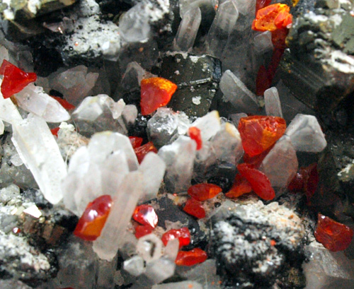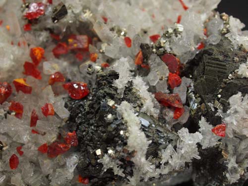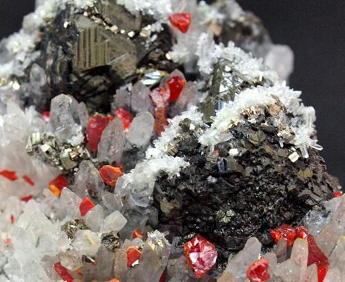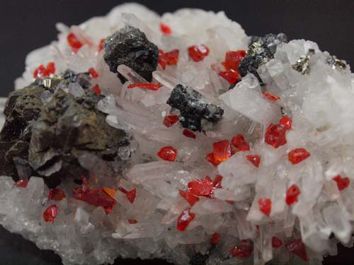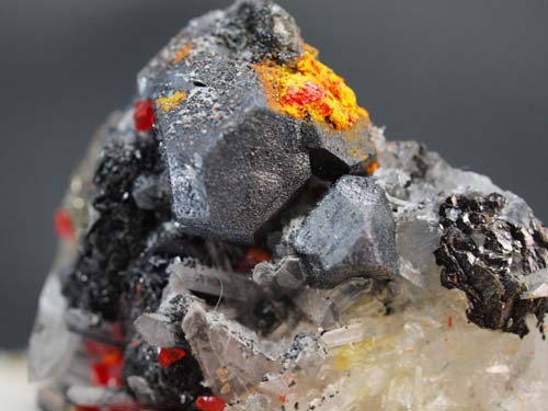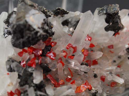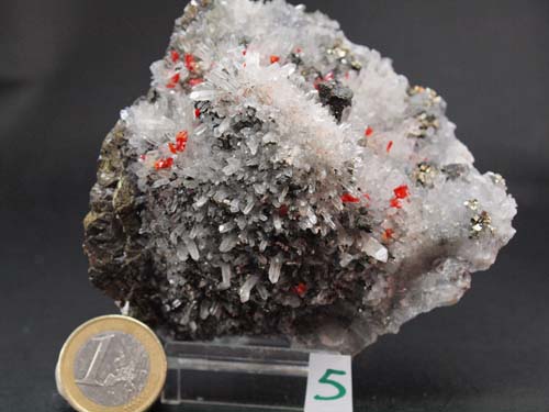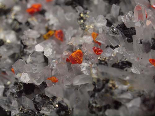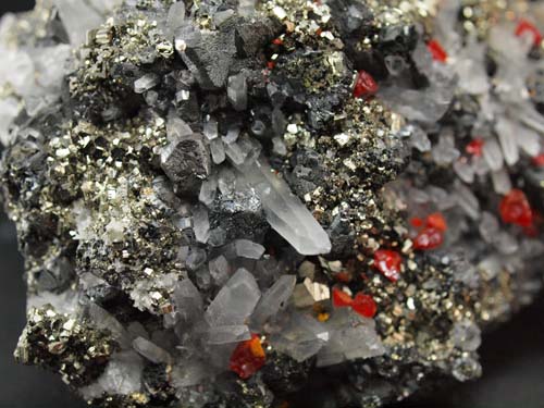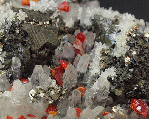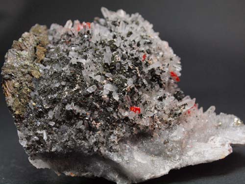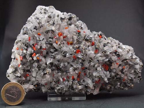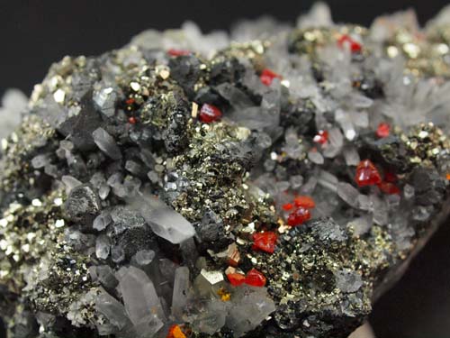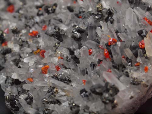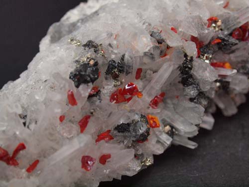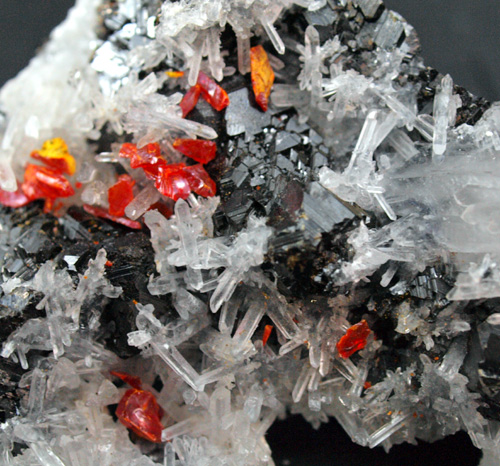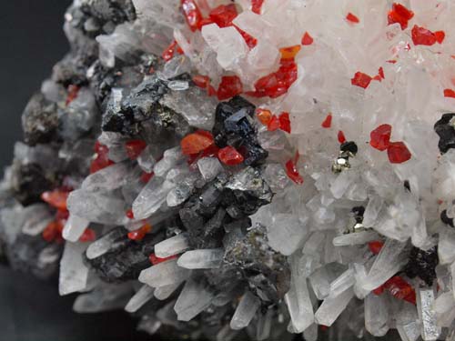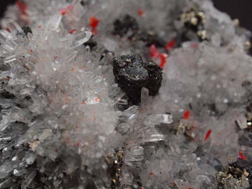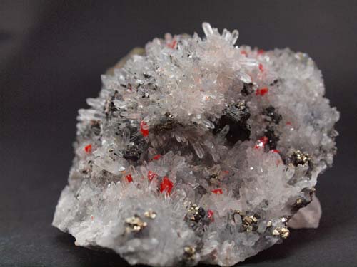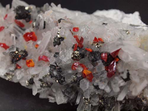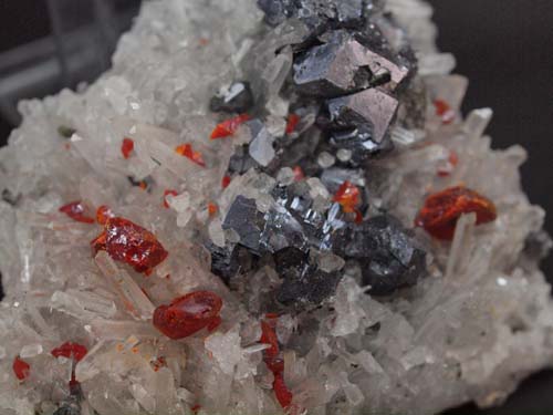Quartz crystals with realgar crystals, galena crystals (galena crystals size 1cm) on it and sphalerite crystals.Size 5cm x 7cm x 3cm