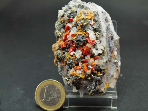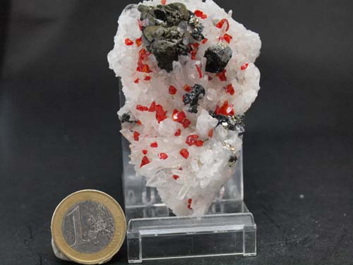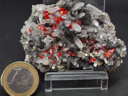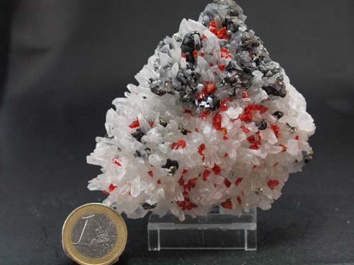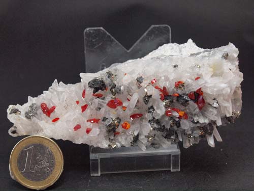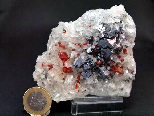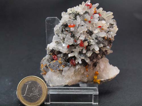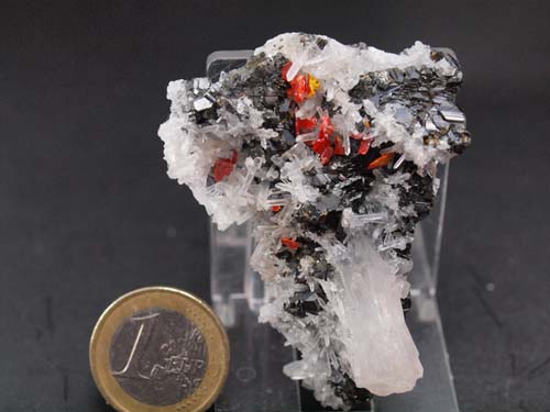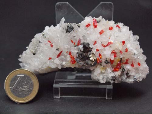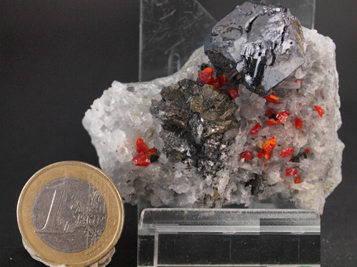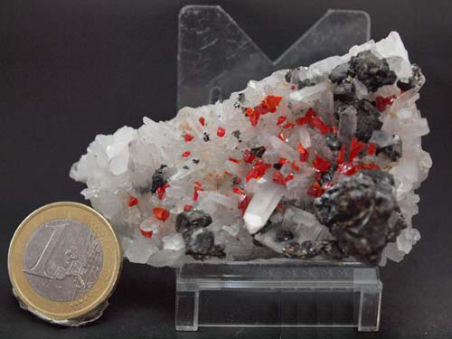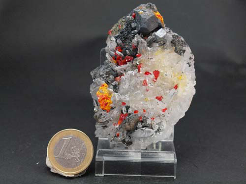 Quartz crystals with realgar (realgar crystal size 1cm) and galena crystals on itSize 7cm x 8cm x 3,5cm
