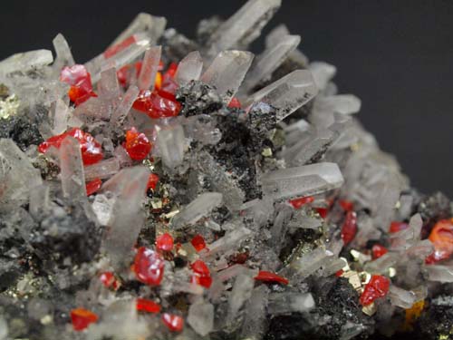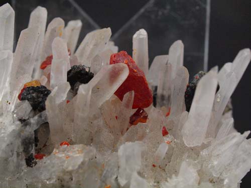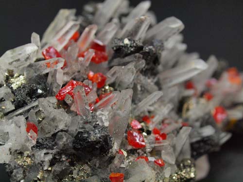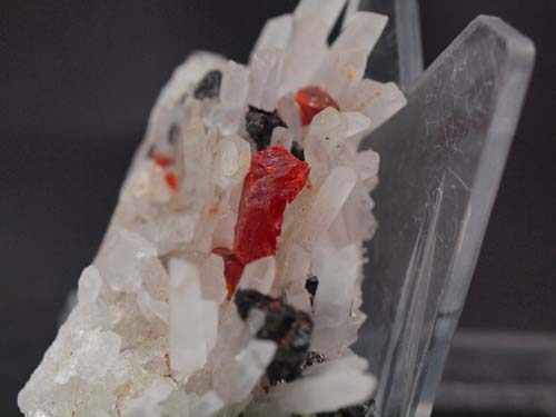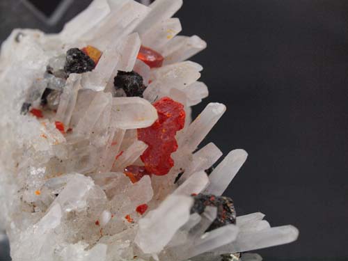 Quartz crystals with realgar crystals on it and sphalerite crystals (sphalerite crystal size 1,5x1,5 cm).Size 4cm x 7cm x 2cm