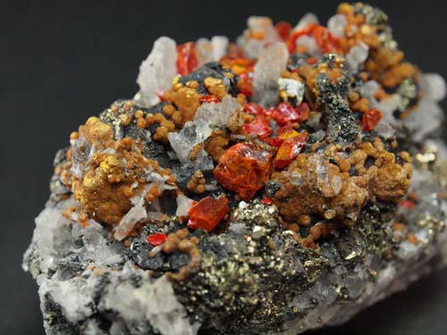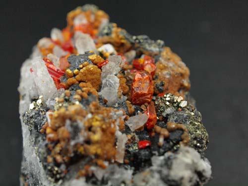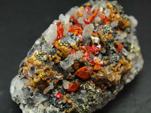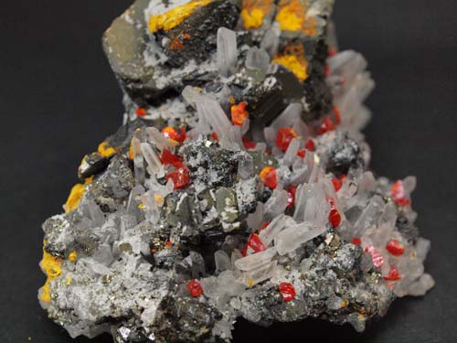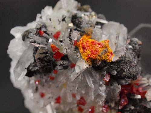 Quartz crystals with realgar crystals on it and sphalerite crystals with some orpiment.Size 6cm x 5,5cm x 2cm