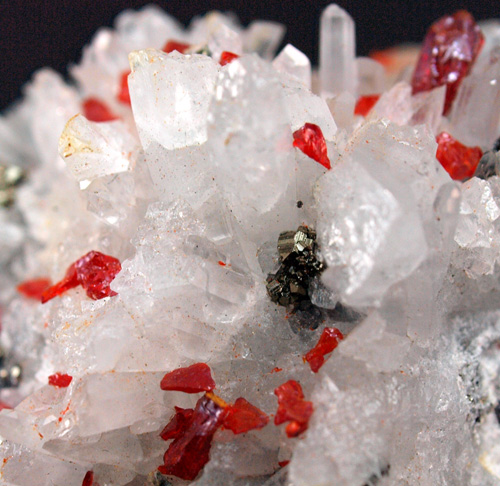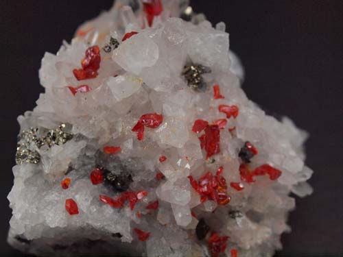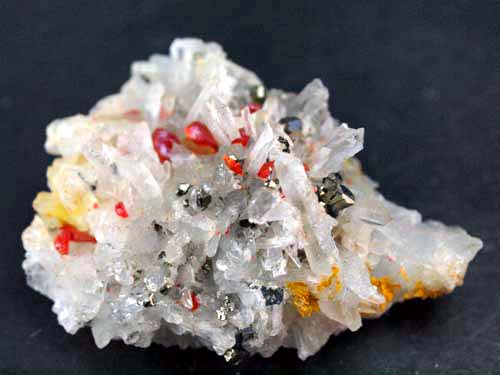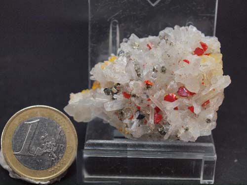 Quartz crystals with realgar crystals on it and pyrite crystals.Size 3cm x 4cm x 2cm