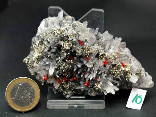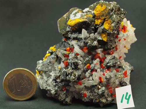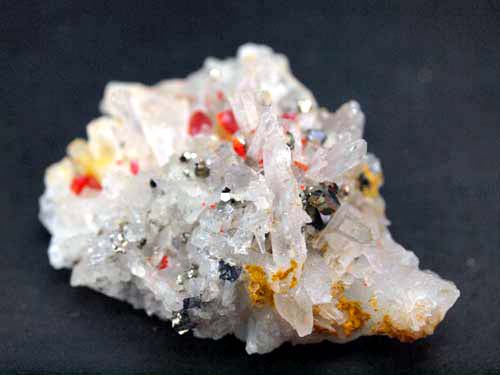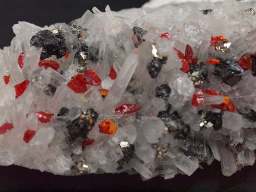 Quartz crystals with realgar crystals on it and pyrite crystals on sphalerite and galena crystals.Size 4cm x 9cm x 3,5cm