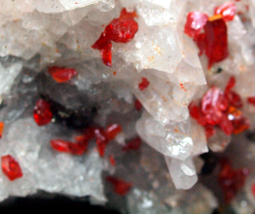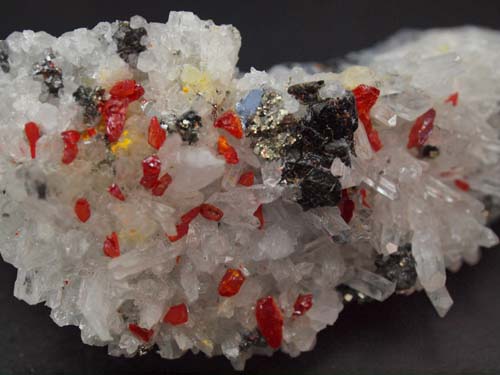 Quartz crystals (quartz crystals size 1,5cm) with realgar crystals (realgar crystal size 1cm)on it and sphalerite crystals.Size 2cm x 5cm x 4cm
